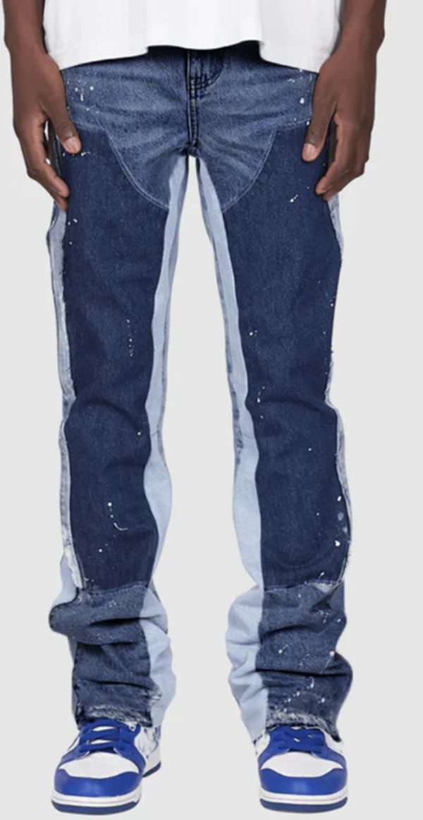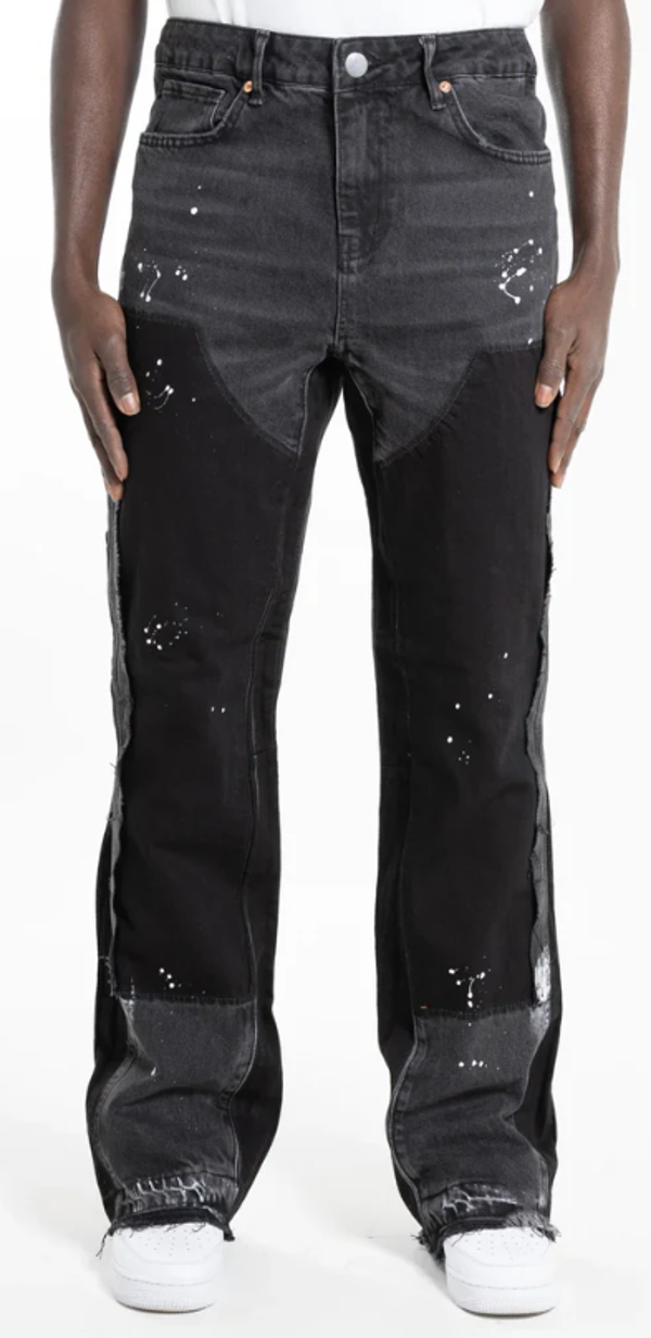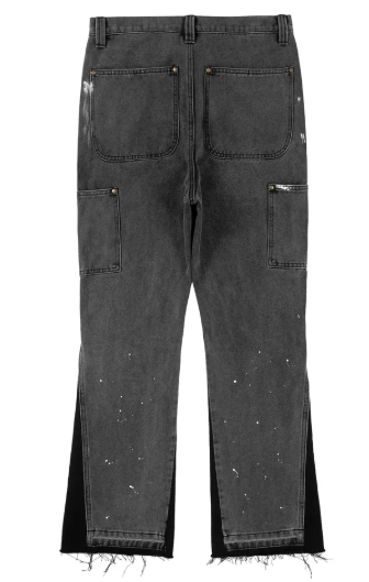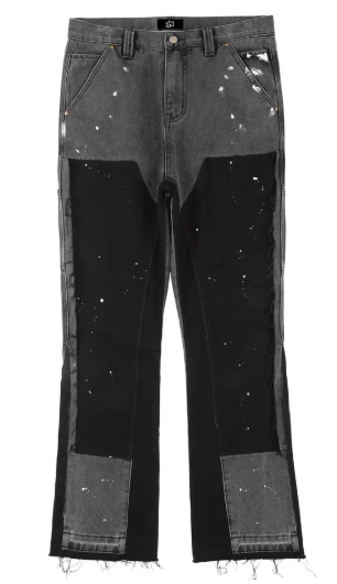 Carpenter jeans met rechte pijpenUitlopende, relaxte pasvormZwart of blauw met witte verfspatten100% katoenValt normaal qua maat